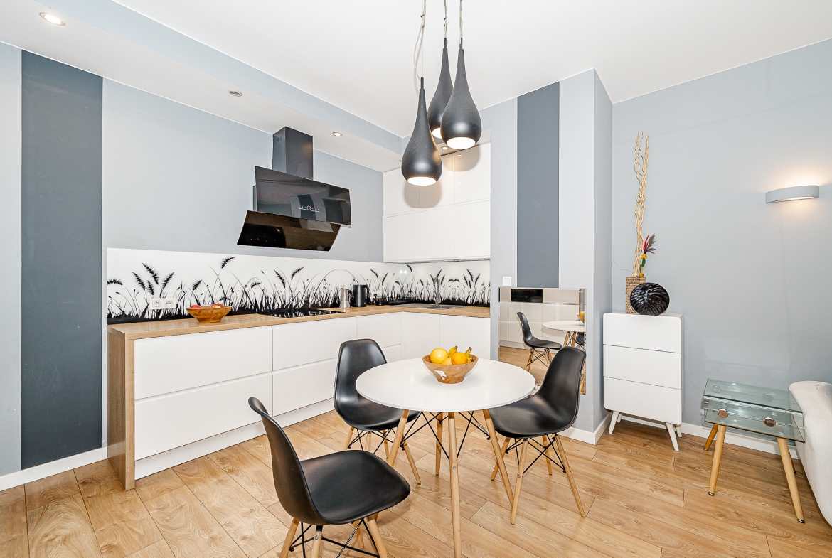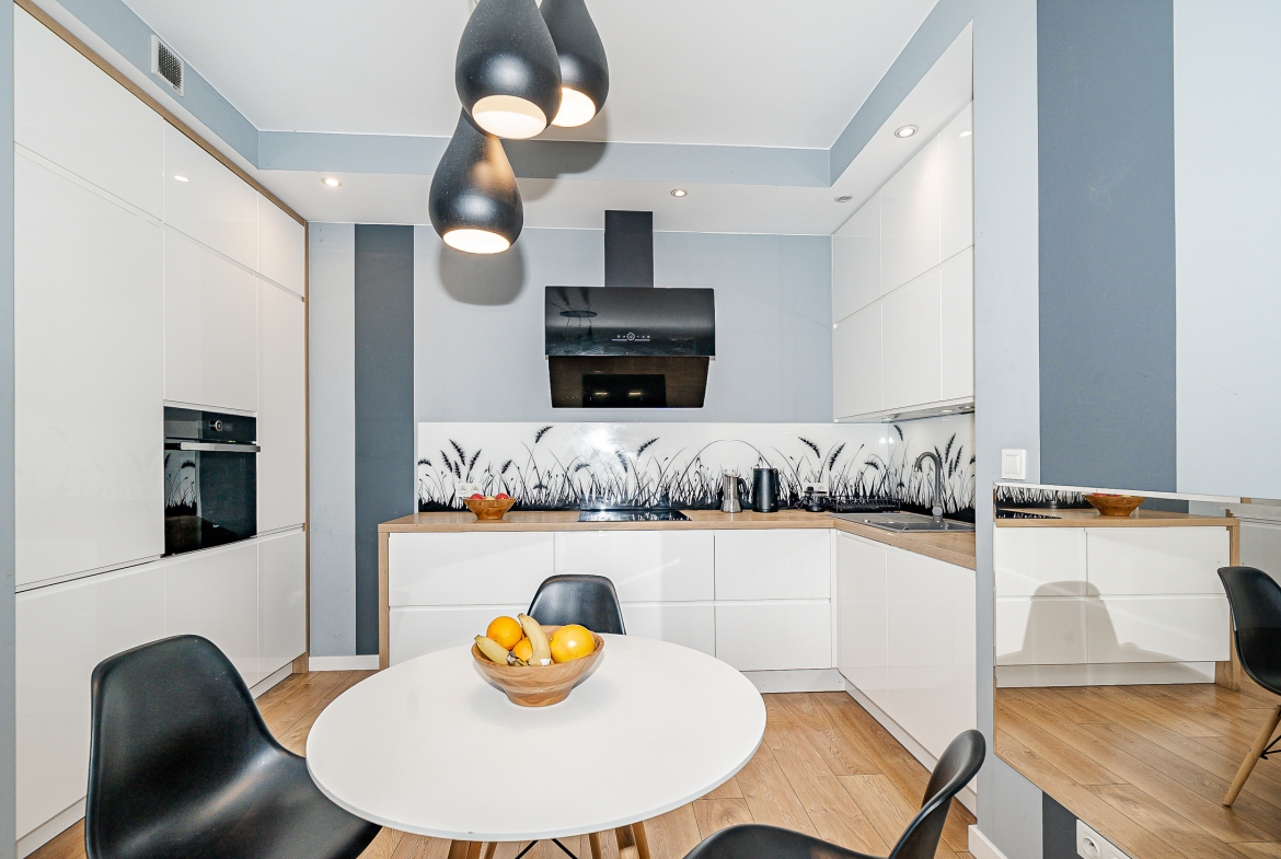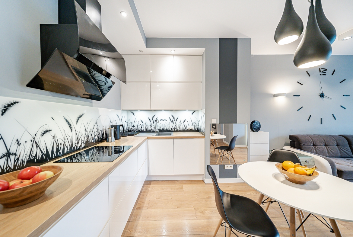 kuchnia otwarta, w pełni wyposażona: zmywarka, płyta indukcyjna, piekarnik, mikrofalówka, lodówko-zamrażarka