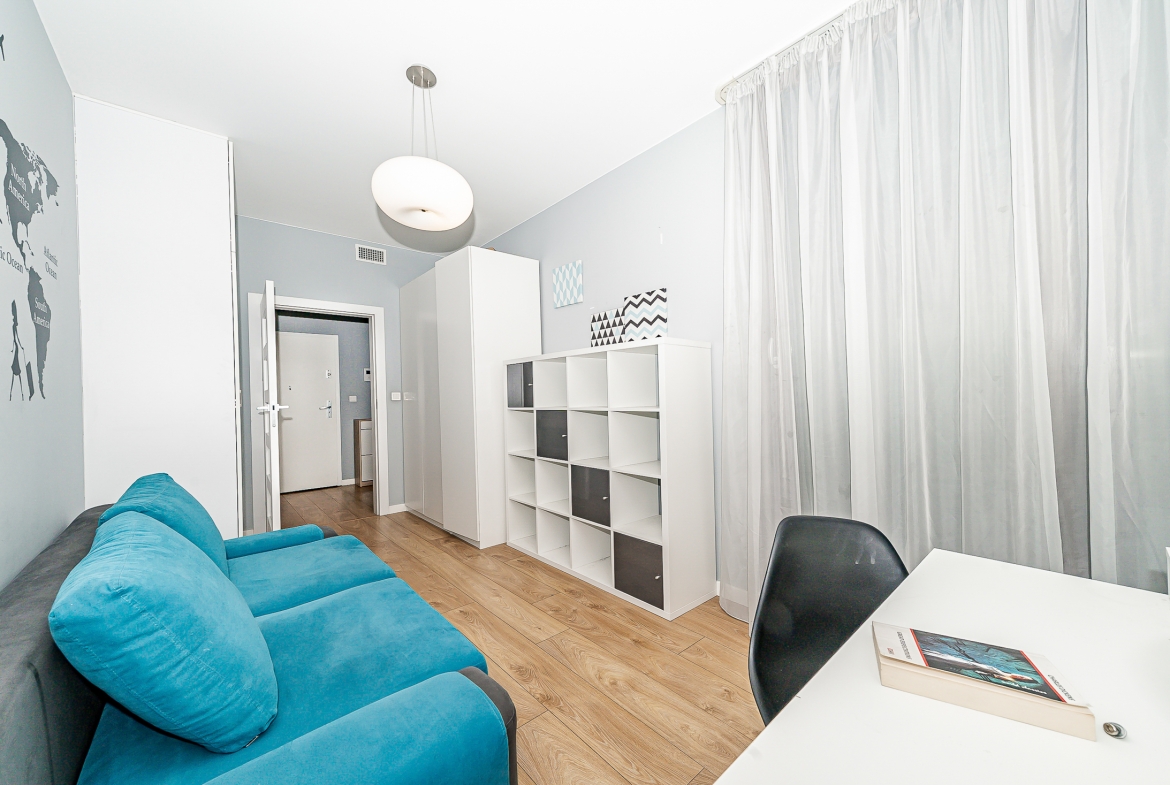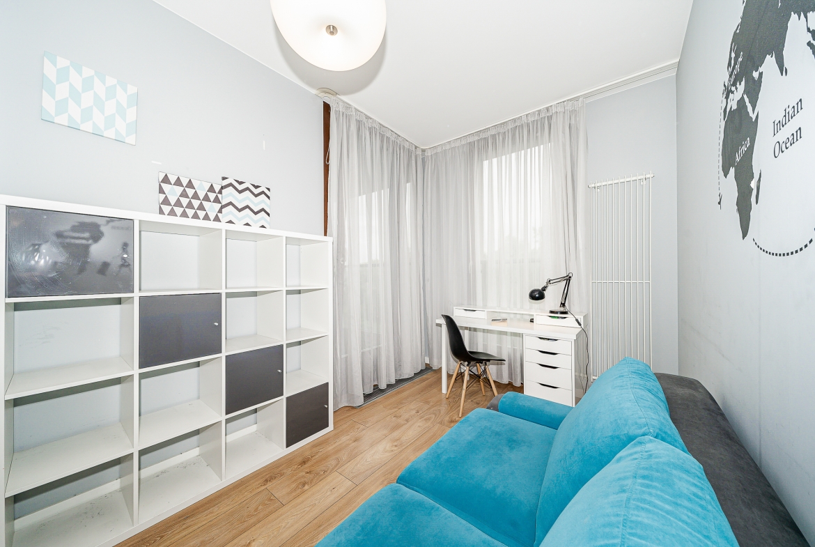 gabinet z regałem otwartym, biurkiem, sofą do spania, wyjściem na balkon