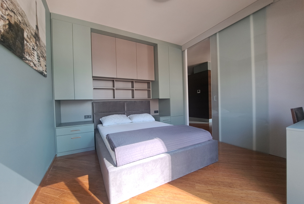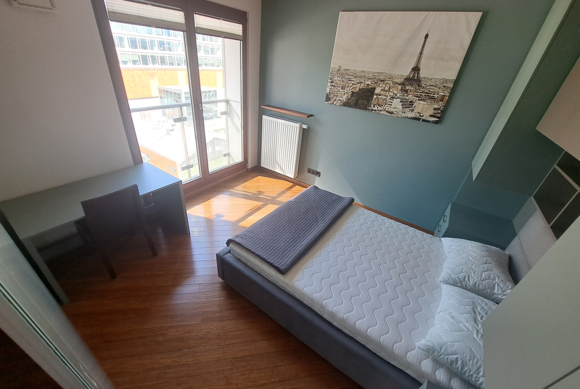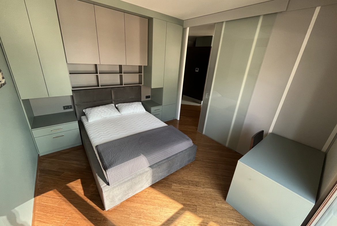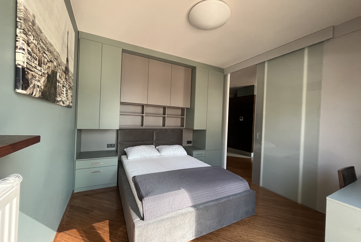 Sypialnia z łóżkiem z materacem. Pojemna zabudowa z miejscem na biurko/toaletkę.