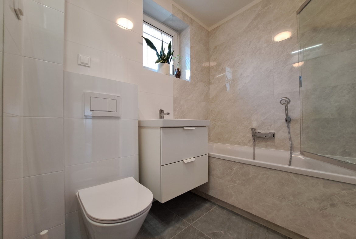 Kuchnia w pełni wyposażona: zmywarka, płyta indukcyjna, piekarnik parowy, lodówko-zamrażarka. Łazienka z wanną i zasłoną prysznicową.