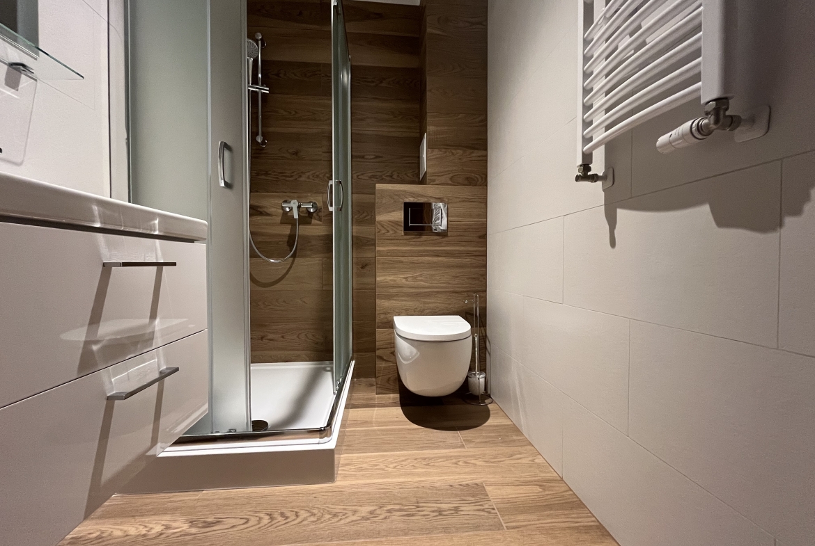 Łazienka z kabiną prysznicową, umywalką, WC.